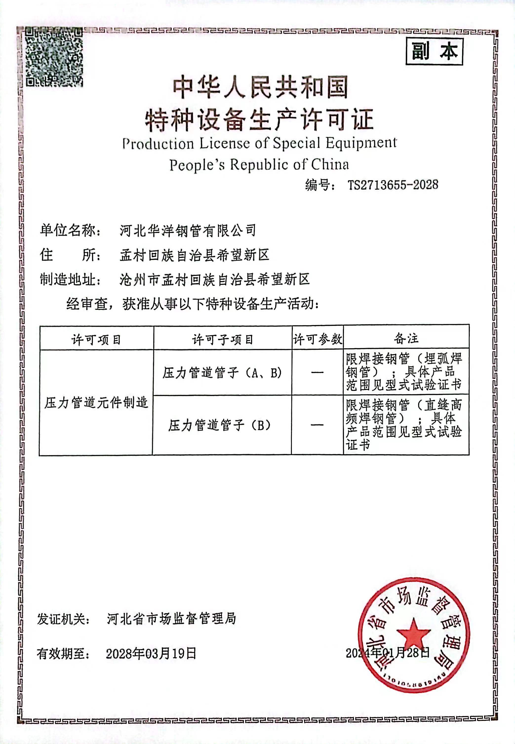 公司現有17條新型的自動化鋼管生產線,包括Φ73-660.4高頻直縫焊鋼管生產線14條、Φ406.4-Φ1422.4直縫雙面埋弧焊鋼管生產線3條,并配備有一條防腐生產線,可進行3PE、2PE、FBE、2PP、3PP防腐處理,同時還可提供鋼管深加工服務。公司擁有先進的理化實驗室,可承擔鋼管的各項物理及化學檢測與試驗。公司先后取得了ISO9001質量管理體系認證、ISO14001環境管理體系認證、ISO45001職業健康安全管理體系認證、特種設備制造許可證、API5L和API2B認證證書、歐盟CE認證、俄羅斯GOST認證、中海油入網證、安全生產標準化二級企業等標準質量體系認證。